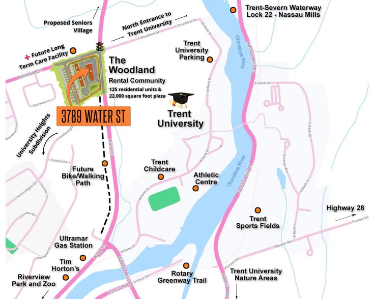 • New retail development in North Peterborough at gateway intersection to Stony Lake and cottage country • Adjacent to north entrance and parking for Trent University. Home to 10,200 sudents and 1,600 employees (3rd largest employer in Peterborough) • Up to 22,000 SF with possession estimated for Spring/ Summer 2024 • Intersection of Water Street and Woodland Drive to be lighted and fully urbanized by 2023 • Close to upscale University Heights neighbourhood with significant new developments including Woodlands Acres, Summer Lane with 54 townhomes and 71 luxury rental suites as part of this development • Application submitted for 224 bed long term care facility across Woodland Drive as first phase of large development known as Trent University Seniors Village • Total 2021 population within 5 kilometers of 21,880, representing a 12% increase over 2016