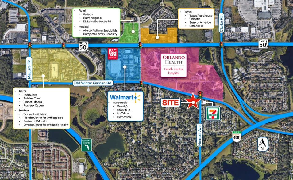 Jamison Commercial Partners is pleased to present this 0.92 AC corner, located on Old Winter Garden Road. Walkable to Orlando Health's Health Central as well as many desirable retail groups nearby. » 0.92 Acres » Can do ~5,200 SF retail building with a drive-thru » Dispensary/Coffee/QSR Location » Walking distance to Orlando Health’s Health Central » Lighted intersection with access from both Old Winter Garden Rd and Hempel Ave » Convenient access to SR 408, Hwy 50, Florida Turnpike and SR 429 » Nearby Retail includes Walmart, Chick-fil-A, Wendy’s, Chipotle, Starbucks and more