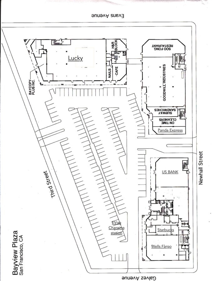 Bayview Plaza presents is a large-format retail center in one of San Francisco’s fastest-evolving neighborhoods. Located at the high-visibility intersection of 3rd Street and Evans Avenue, this shopping center offers exceptional frontage, strong foot traffic, and seamless access via Muni T-Line, multiple bus routes, and bike lanes. The property is surrounded by a robust mix of national and local tenants including Wells Fargo, US Bank, Starbucks, Goodwill, Subway, and Panda Express, and sits adjacent to several major development projects totaling over 1.5 million square feet.