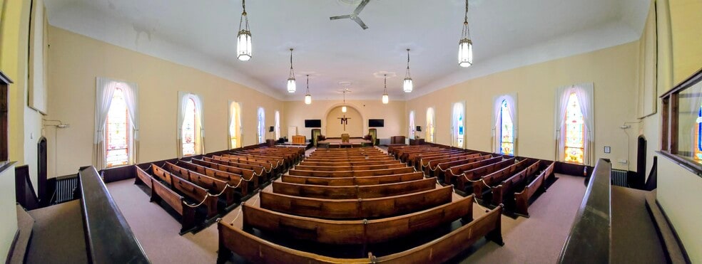 Church organization is relocating. Building has updated 400 Amp-3 phase power supply, steam hot water heat and well maintained. Lower level has an equipped kitchen, two bathrooms, office and classrooms.