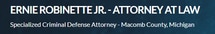 L'avocat Ernie Robinette Jr. pratique le droit dans le comté de Macomb depuis plus de 30 ans à titre d'avocat de la défense criminelle. Il comprend le paysage du système juridique du comté de Macomb, puisque plus de 90 % des affaires qu'il traite se trouvent dans le comté de Macomb. Les services qu'il gère comprennent les contraventions routières, le DUI/OWI et la défense criminelle.