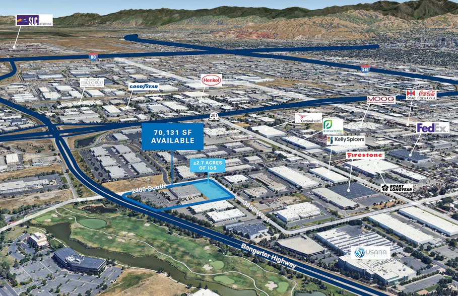 For Sale or Lease – 70,131 Industrial Building with ±2.7 Acres IOS 3865 W 2400 S, West Valley City, UT Located along Bangerter Highway, this 70,131 SF facility features 27,089 SF of office, 43,042 SF of warehouse with 26’ clear height, 11 dock doors, 1 ramp door, ESFR, and 2,500 amps of power. The site includes ±2.5 acres of industrial outdoor storage, 229 auto stalls, trailer parking potential, and excellent access to I-15, I-80, I-215, and SLC International Airport. Ideal for logistics, distribution, or corporate operations.