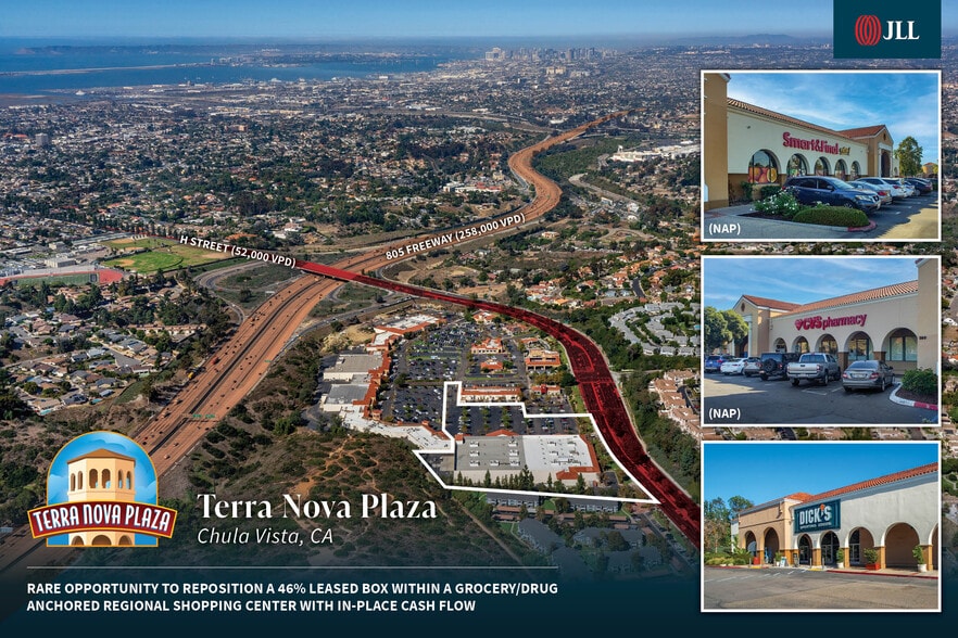 JLL has been exclusively retained by Ownership to offer qualified investors the opportunity to acquire a portion of Terra Nova Plaza (the “Property”), a 96,114 square foot asset within a premier ±301,000 SF regional shopping center in Chula Vista, CA. The Property is optimally positioned directly off the I-805 Freeway and H Street, benefiting from exceptional exposure to 257,000 vehicles per day. The offering features a fully stabilized asset that is 100% leased to two investment-grade tenants, Dick’s Sporting Goods boosting annual sales of$13.4B in 2025, alongside Floor & Décor with $4.69B in 2025 annual sales, providing investors with reliable in-place cash flow and long-term value in a high-traffic, sought-after retail corridor.