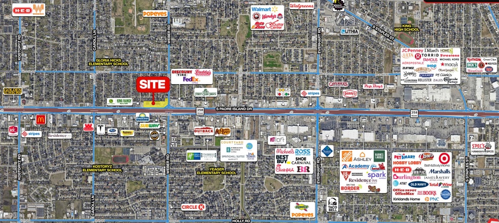 • New construction retail with Starbucks now open! • Leases will be NNN • Multiple access points from frontage road & Weber Rd • Great pylon & storefront signage opportunity • Approx. 111,712 cars per day (TXDot) • Excellent visibility to S Padre Island Dr located at the intersection of SPID & Weber Rd • Primary retail corridor with multiple national tenant neighboring such as H-E-B, Target, Best Buy, Sam's Club, Total Wine, TJ Maxx, Embassy Suites by Hilton, FedEx, Discount Tire, Sprouts, Ross, DDs, Melrose & more