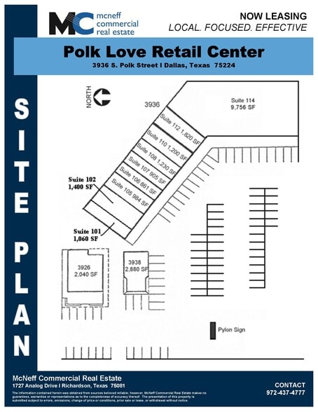 | Total Space Available | 1,230 SF | Frontage | 170’ on S Polk St |