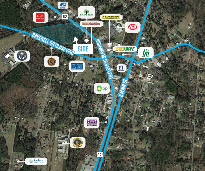 Excellent location next to recently remodeled Dollar Tree and new AutoZone. Zoned highway commercial. Water and sewer available. Direct access from Hwy. 52. Local retailers include AutoZone, Subway, Dollar General, BP, and NAPA. May be subdivided. 7,500 VPD. BTS and lease opportunities available.