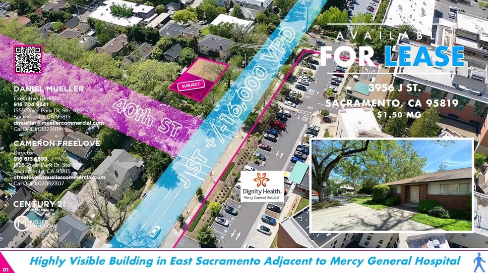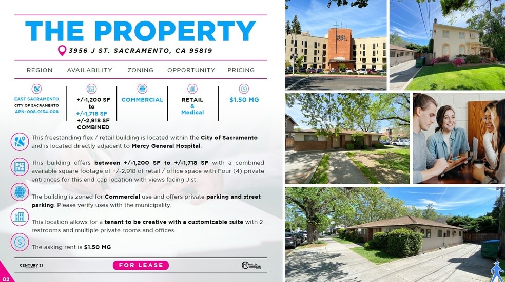 This freestanding flex / retail building is located within the City of Sacramento and is located directly adjacent to Mercy General Hospital. This building offers +/-1,718 SF of retail / office / medical space with Four (4) private entrances for this end-cap location with views facing J st. The building is zoned for Commercial use and offers private parking and street parking. Please verify uses with the municipality. This location allows for a tenant to be creative with a customizable suite with 2 restrooms and multiple private rooms and offices.