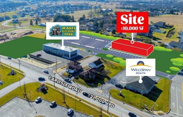 The project at 3966 Carlisle Road features a commercially zoned lot available for sale, ground lease, or build to suit next a newly proposed Mavis Discount Tire. Current concept plan shows up to 10,000 SF and offers signalized access along Carlisle Road (21,049 VPD). Within the immediate area you’ll find major brands such as Weis Markets, AutoZone, Mavis Discount Tire, Stauffers, McDonald’s, Walgreen’s and Royal Farms to name a few. The property would be a great development opportunity for any retail, medical, or service user enter the growing Dover market