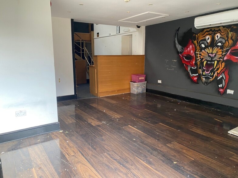 External width of parking area 7.19m x 7.94m part covered with external access ramp to double doors with side windows. Reception 4.82m x 4.63m Lobby to Disabled WC 1.97m x 3.67m Disabled WC 1.5m x 2.2m with non-slip flooring, wash hand basin, Dyson air blade, Creda wall heater. Under mezzanine area 9.12m x 7.44m with ceiling height of 2.14m with LED spot lighting and air conditioning. Mezzanine via metal staircase with hand rails 5.11m max x 7.5m, four pendant lights, polycarbonate roof light & air conditioner. With two private treatment rooms.