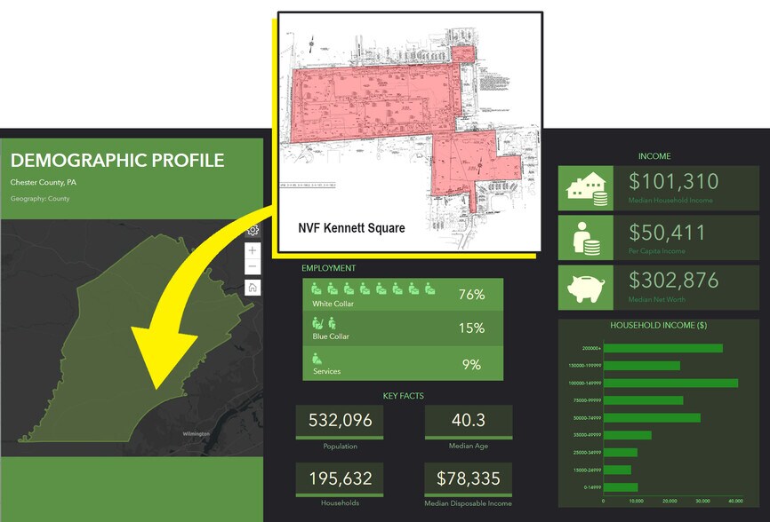 The former National Vulcanized Fiber Company site in Kennett Square, PA coming to market offers a rare opportunity to acquire a superbly located and prime large-scale development site in the booming Borough of Kennett Square, Pennsylvania. The offering is an assemblage of four parcels containing +/-24.7 net acres. The location benefits from walkability to nearby shops, restaurants, parks and other amenities as well as some of the strongest demographics in the region. Located in Chester County, Pennsylvania and surrounded by the beautiful Brandywine Valley, Kennett Square offers something for families, singles, and seniors. Historic homes, a bustling downtown with upscale boutiques, retailers, and restaurants, ample amenities, and exceptional public and private schools, all enhance this thriving community. A sense of community pride on display throughout the year at festivals and events make this location even more attractive. Several nearby multifamily success stories shine a light on this location for medium to high density residential.