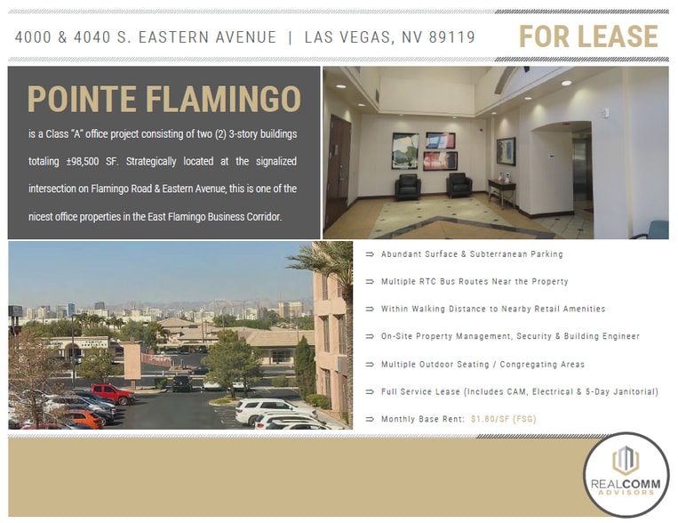 Pointe Flamingo is a Class “A” office project consisting of Two 3-story buildings totaling 98,500 SF±. Strategically located at the signalized intersection on Flamingo Road and Eastern Avenue. *Most floor plans have virtual tours - see brochure*