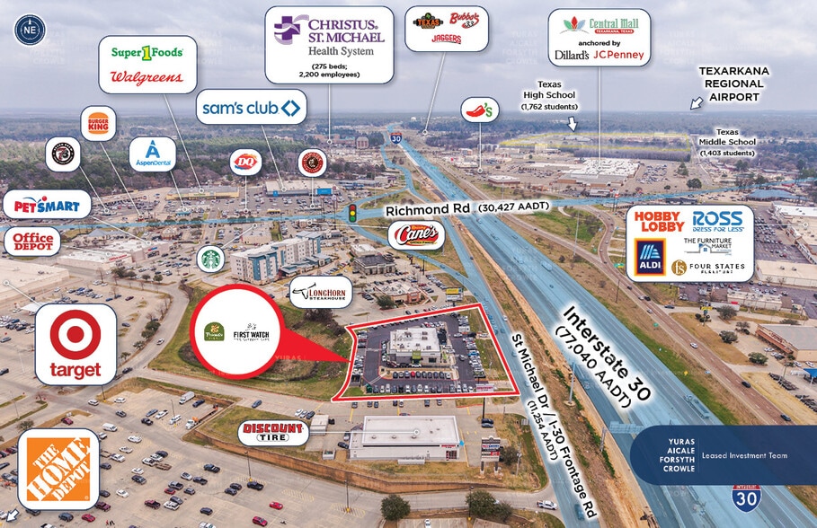 Excellent Multi-Tenant Location: Highly visible and easily accessible location along Interstate 30 (77,040 AADT), allowing the property to capture significant local and commuter traffic. Richmond Ranch Shopping Center: Asset is part of the Richmond Ranch Shopping Center, a major Target, Home Depot, Sam’s Club, and Kohl’sAnchored power center. Ideal Demographic Base: The five-mile radius serves a populous region of 71,826, with an average annual household income of $78,413 within three miles. Texarkana College: Beneficial proximity to Texarkana College, with a student body of 3,575 people as well as Texas A&M University – Texarkana (2,112 students). Christus St. Michael Hospital: One mile from Christus St. Michael Hospital, with 275 full time staffed beds and 2,200 employees. Growing Market Dynamics: Projected income increases within 1-, 3-, and 5-mile radii over the next five years poise this multi-tenant asset and Texarkana for steady concurrent growth