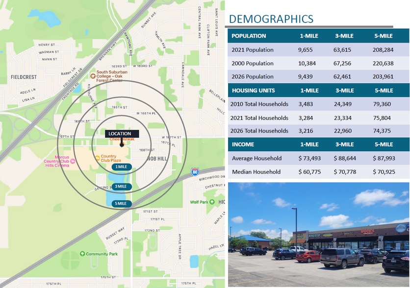 4009 W 167th Street is a well-positioned retail suite within Country Club Hills Plaza, a fully leased neighborhood shopping center located along the highly trafficked 167th Street retail corridor in Country Club Hills, Illinois. The property benefits from excellent visibility, strong traffic counts, and convenient access to I-57, making it an attractive destination for both local and commuter traffic. The plaza is shadow-anchored by a Walmart Supercenter and surrounded by national retailers, dining, and service-oriented businesses, creating consistent consumer draw throughout the day. Built in 2007, the center features modern construction, ample surface parking, and a strong tenant mix anchored by food, personal care, and service users. The subject suite at 4009 W 167th Street is part of an established retail lineup that serves a dense residential trade area, with over 200,000 people within a five-mile radius and solid householdincomes. The location offers long-term stability driven by necessity-based tenants, strong co-tenancy, and continued demand along one of the area’s primary commercial corridors. This property is well suited for investors or owner-users seeking exposure to a stabilized retail environment with strong fundamentals, excellent accessibility, and durable area demographics.