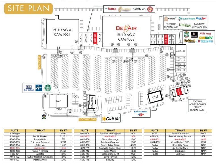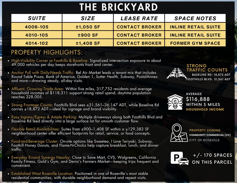 Multiple retail suites available at The Brickyard, a ±129,382 SF Bel Air-anchored neighborhood center on the signalized hard corner of Foothills Blvd and Baseline Rd in West Roseville. Available spaces range from a ±900 SF inline suite to a ±31,468 SF former Rite Aid box — with options for retail, food and beverage, medical, fitness, and service concepts. The center's tenant mix includes Round Table Pizza, Bank of America, Golden 1, Sutter Health, Subway, Starbucks, Haute Coffee, A Plus Dental Care, Sweetea, I Love Teriyaki, Flame-N-Chickz, Foothill Honey Donuts, and PostalAnnex. Save Mart, CVS, Dunkin', Walgreens, California Family Fitness, Gold's Gym, and Denio's Farmers Market sit directly across the street or nearby at Foothill Junction, keeping errand-driven visits constant. Available Suites: Suite 110: ±2,200 SF endcap retail suite — Contact Broker Suite 4006-105: ±1,050 SF inline retail suite — Contact Broker Suite 4010-105: ±900 SF inline retail suite — Contact Broker Suite 4014-102: ±1,408 SF former gym space — Contact Broker 4004 Foothills Blvd: ±31,468 SF former Rite Aid — $1.25 PSF, NNN