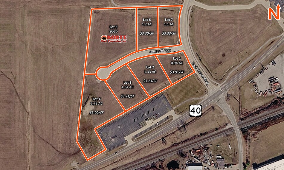 (6) shovel-ready lots ranging from 0.94 acres to 2.75 acres (maximum 6.36 acres contiguous) off of Route 40. All utilities available on site. Ideal location for a car wash, retail strip center, quick service restaurant (QSR) or even a warehouse development. Zoned Industrial. Janet Beth Way development is located at the entryway to Highland, 1.5 miles from St. Joseph’s Hospital and 5.5 miles from Interstate-70. Tax Increment Finance (TIF) and Enterprise Zone incentives available. Sale Price: Lot 1: 0.94 AC – $3.91/SF Lot 2: 1.33 AC – $3.23/SF Lot 3: 1.34 AC – $3.21/SF Lot 4: 2.75 AC – $3.00/SF Lot 6: 1.20 AC – $3.30/SF Lot 7: 1.10 AC – $3.33/SF