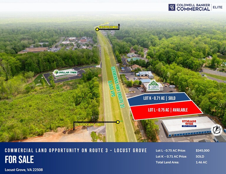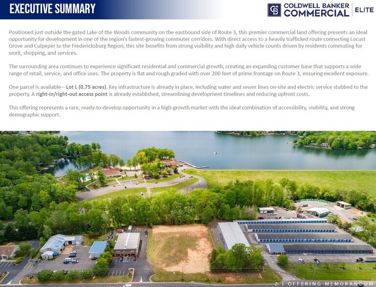 Positioned just outside the gated Lake of the Woods community on the eastbound side of Route 3, this premier commercial land offering presents an ideal opportunity for development in one of the region’s fastest-growing commuter corridors. With direct access to a heavily trafficked route connecting Locust Grove and Culpeper to the Fredericksburg Region, this site benefits from strong visibility and high daily vehicle counts driven by residents commuting for work, shopping, and services.