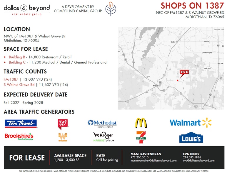 Building description : Property Highlights – Shops on 1387 Signalized Hard corner at FM-1387 & Walnut Grove with 24,000+ VPD and excellent visibility/access Adjacent to grocery-anchored retail (Tom Thumb) and McDonald’s, driving strong daily traffic Right across from Midlothian Heritage High School (±1,800) and Walnut Grove Middle School (800+) students) Surrounded by rapid residential growth, supporting strong daytime and evening demand Building highlights Building B – Retail / Restaurant • ±14,800 SF total retail building , Divisible suites from 1,200 – 3,500 SF • Designed for restaurant, fast casual, and service-oriented retail , • Ideal for Coffee, Casual dining, Dessert, and boutique retail concepts • Strong visibility along FM-1387 with high traffic counts • Benefits from direct cross-traffic from adjacent national retailers • High school proximity drives consistent daytime and after-school traffic • Built for repeat-visit, daily-needs retail users Building C – Medical / Professional • ±11,200 SF professional / med-tail building , Divisible suites from 1,200 – 3,500 SF • Designed for medical, dental, and general professional users , Ideal for urgent care, dental, med spa, fitness, and office users • Positioned to serve dense surrounding residential communities • Stable, insurance-backed tenant profile with repeat patient visits • Complements retail traffic while maintaining quieter professional environment • Strong long-term demand driven by population growth and family demographics