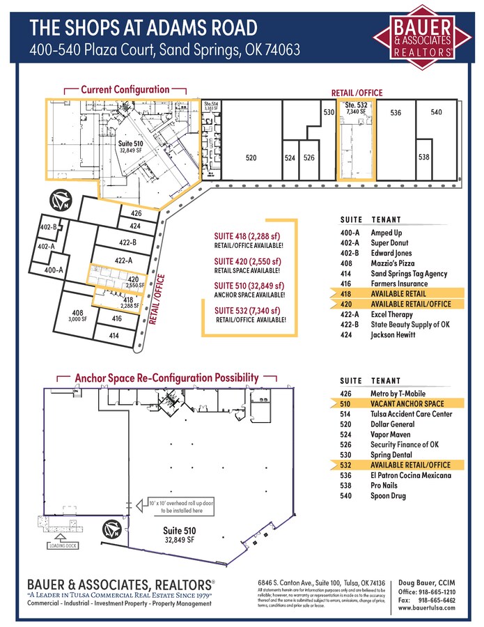 The Shops at Adams Road Flexible Anchor & Inline Opportunities Along HWY 51 / HWY 412 400–540 E. Plaza Court | Sand Springs, OK Located along the high-traffic HWY 51 / HWY 412 corridor, The Shops at Adams Road offers outstanding visibility and access within one of Sand Springs’ primary retail corridors. Opportunities range from ±2,288 SF shop suites to a ±32,849 SF anchor space. Flexible layout options are perfect for fitness, entertainment, restaurants, medical, general retail and specialty retail, or service-oriented users seeking a high-exposure location. Positioned to support scalable national concepts and growing local businesses alike, the center combines strong expressway frontage, convenient access, and ample surface parking in a proven trade area.