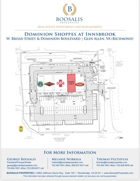 Position your business at Dominion Shoppes, a well-established retail center located at the signalized intersection of Dominion Boulevard and W. Broad Street in Glen Allen, VA. This 3,717 SF retail space offers excellent visibility with over 49,000 vehicles per day, providing strong exposure in a high-traffic corridor. The center is strategically situated at the entrance to Innsbrook Corporate Center, one of the region’s largest office hubs, featuring over 5.4 million square feet of office space, 22,000+ employees, and a strong daytime population. Surrounded by national and regional retailers including Starbucks, Noodles & Company, and Charley’s Cheesesteaks, the property benefits from a vibrant retail environment and affluent demographics, with average household incomes exceeding $150,000 within a one-mile radius. This prime retail opportunity offers ample parking and strong co-tenancy, making it ideal for a variety of retail, service, or restaurant users seeking a high-visibility location in a thriving commercial corridor.