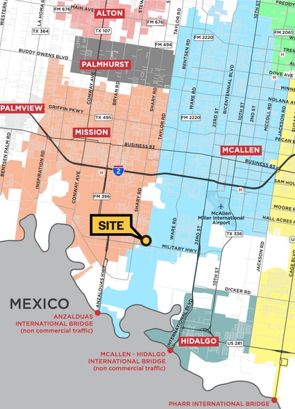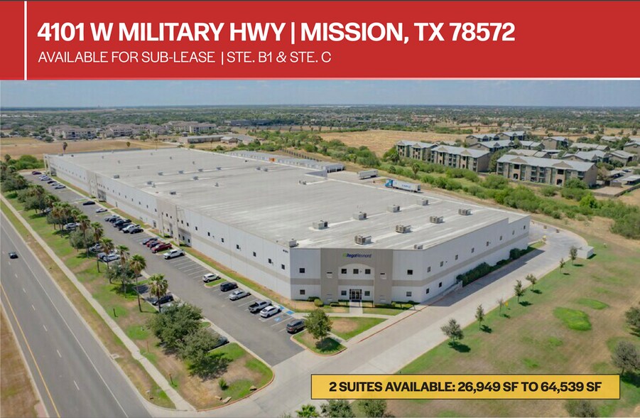 4101 W Military Hwy, in Mission Texas, is a 250,312 SF industrial warehouse located in the well established Sharyland Business Park, offering two suites available for lease. Suite B1 has 26,949 SF, with 2 dock high doors with 1 ramp. Suite C has 37,590 SF, with 5 dock high doors. Key features include 28’ clear height, concrete tilt walls, ESFR fire protection and LED lighting. The building is positioned with easy access to Interstate 2, providing connectivity to Interstate 69C for north-south transit. Just a short drive from the Anzalduas International Bridge, this location is ideal for businesses requiring cross-border operations and access to major transportation hubs.