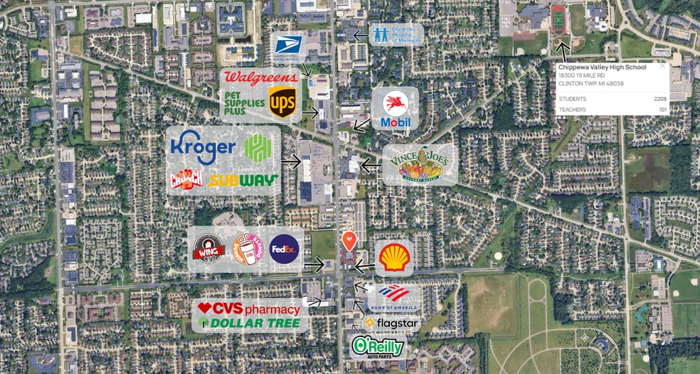 Located at the high-traffic NEQ of 18 Mile and Garfield Rd, this 6,212 SF space sits alongside My Salon Suites and benefits from 40,000 vehicles per day passing directly in front. Surrounded by top retailers including Kroger, Dollar Tree, CVS, and Vince & Joe's Gourmet Market, the site offers exceptional visibility and co-tenancy in a vibrant retail corridor. Additionally, Chippewa Valley High School, with over 2,200 students, is located within one mile, further driving daily traffic to the area.