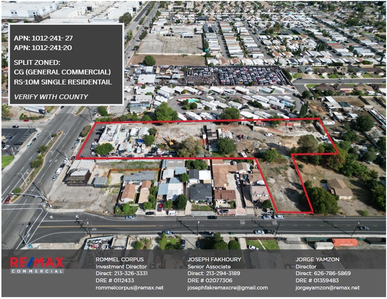 ±2.78 Acres Development Opportunity located at 4137 Mission Blvd, Montclair, CA 91766 Total Land Area: ±120,966 SF Existing Building: ±2,306 SF structure on site High-visibility frontage on Mission Blvd, a major commercial corridor Large contiguous parcel ideal for redevelopment or repositioning Split zoning: CG – General Commercial RS-10M – Single Residential (verify with county) Two APNs: 1012-241-27 and 1012-241-20 Flexible development potential for commercial, mixed-use, or residential uses (buyer to verify) Surrounded by dense residential neighborhoods and commercial uses Strong accessibility with major street exposure and nearby regional traffic corridors