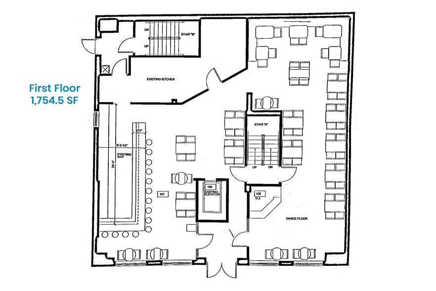 - Space includes kitchen, dining/lounge areas, a bar on each level, room for dance floor, stairs, elevator, storage, large windows, and restrooms