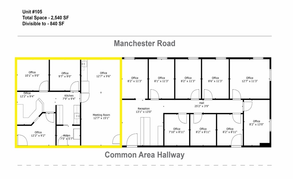 Unit #105 offers approximately 2,540 SF, divisible to 840 SF, and includes 14 private offices, a welcoming reception area, a spacious conference room, and a convenient kitchenette. This suite is ideal for professional or medical office users requiring multiple private workspaces.