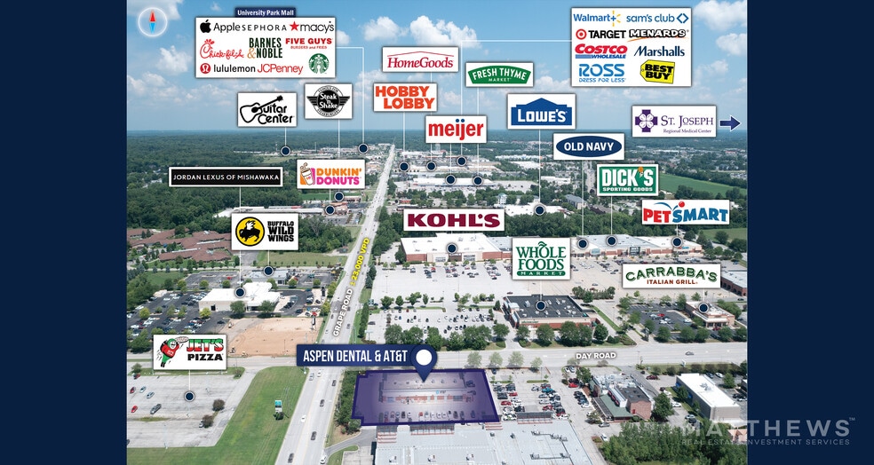 - Prime Hard Corner Location: Located at a signalized intersection along Grape Road (23,495 VPD) and Day Road (6,284 VPD)