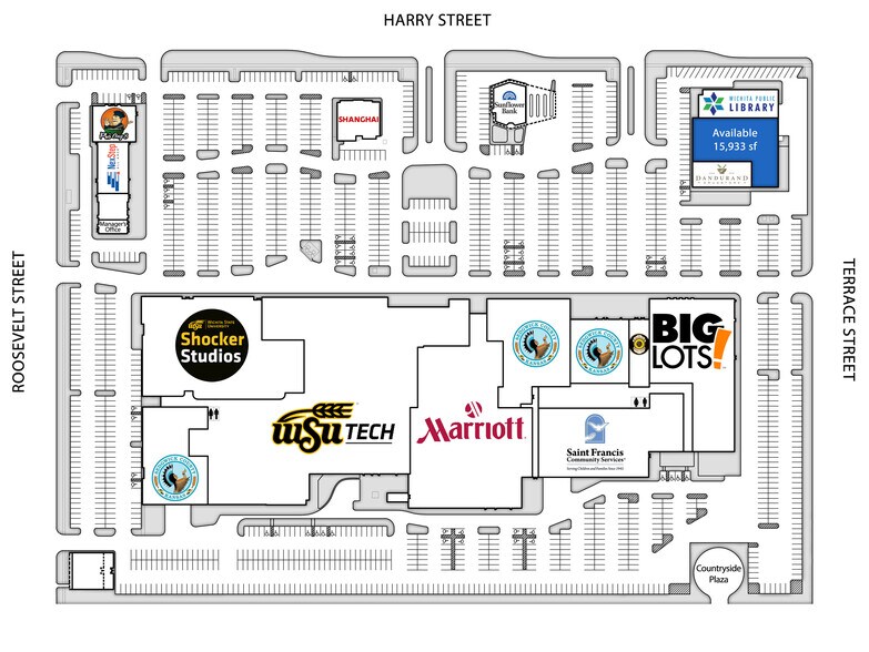 WSU South Campus includes WSU Shocker Studios, WSU Tech, NexStep Alliance, Marriott International, Saint Francis Community Services, DANDURAND Pharmacy, Big Lots, Sedgwick County Comcare, Sunflower Bank, Shanghai Restaurant, Pho Ong Restaurant, Wichita City Library Branch. Approximately 15,946 square feet of space is available between the City Library land DANDURAND PHARMACY that can easily be divided. (See example on page 3 of flyer). The Campus population approximates 2,000 - 2,500 students, faculty, and employees of a variety of businesses on-site.