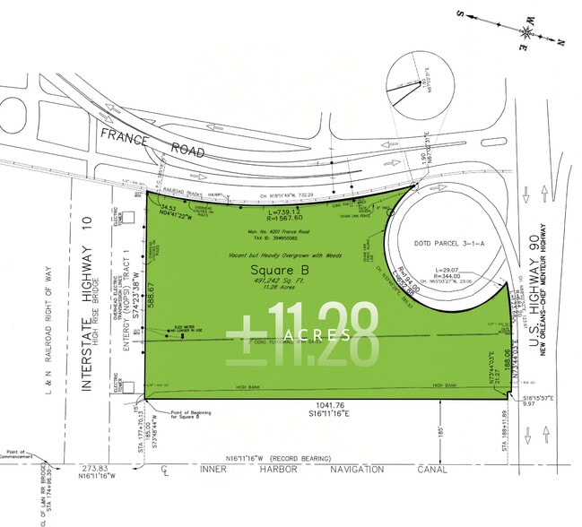 4201 France Road is a rare, stabilized, compacted and filled ±11.28 acre industrial site with 1,040 LF of water frontage. The site is strategically positioned on the Inner Harbor Navigational Canal (IHNC) within the Port of New Orleans Inner Harbor. As one of the few privately owned tracts in this port district, the heavy industrial zoned site provides a rare mix of barge-depth water frontage, rail integration, and immediate interstate access allowing for key permitted uses such as, heavy manufacturing, storage and distribution, industrial services, logistics and transload, rail and other maritime-dependent industrial operations . The site benefits from a 5.5 mile navigational canal connecting the Mississippi River to Lake Pontchartrain creating unique benefits optimizing waterborne freight, barge access, rail operations, and regional trucking. Size: ±11.28 Acres (stabilized compacted and filled) with 1,040 LF of water frontage Zoned HI- Heavy Industrial and barge accessible Rail: Active NOPB rail line intersecting property Topography: Industrial ready— suitable for laydown, storage and build-to-suit development Location: Positioned on the Inner Harbor Navigational Canal (IHNC) within Port of New Orleans Inner Harbor, direct access to Industrial Canal, Intracoastal Waterway, Mississippi River and Lake Pontchartrain