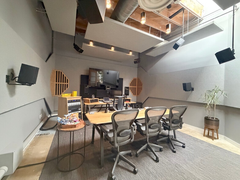 The space features a flexible configuration with three private offices and a conference room, complemented by a reception area that flows into a kitchen space. The conference room is currently set up as a screening suite with a control room, making it ideal for media, production, or creative firms. The interior design emphasizes an industrial aesthetic with exposed wood ceilings, skylights, casement windows, and an ambient lighting system that enhances natural light. Located within Marina Studios, the property provides access to communal areas and amenities, fostering collaboration and creativity. Available immediately for sublease through August 31, 2027, with three parking spaces at $150/month each.