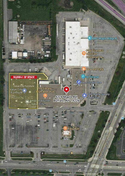 Available former Value City Furniture store consisting of 50,858+/- SF. Located in the Maple Ridge Plaza in the heart of Amherst. High visibility from the traffic light at Maple Road and Sweet Home Road. Excellent exposure minutes from the University at Buffalo's North Campus, Niagara Falls Boulevard, and the New York State Thruway I-290. Co tenants include Taco Bell, AMC Theaters, Conover Chiropractic, Papi Grande's Mexican Restaurant, Subway, Party POP, 3D Fitcamp, K-BBQ & Hot Pot, Price Rite and Leon's Hair Studio. Ample parking. Ideal for national or local tenants including retail, office, or restaurant uses. Can sub divide to 1,500+/- SF up to 50,858. Contact Rick Recckio at 716-998-4422