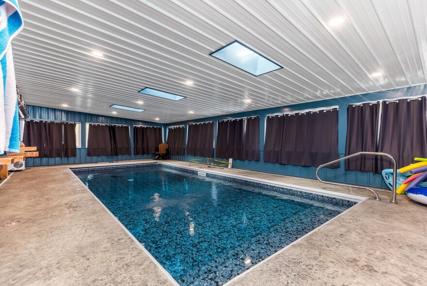The adjacent pole barn home extends the property’s versatility, featuring four bedrooms, four full bathrooms, two half baths, and a flex layout ideal for multigenerational living, extended-stay housing, or specialty use. Two full kitchens and laundry hookups on each level enhance independent living arrangements, while Amish cabinetry, multiple heating and cooling zones, and extensive insulation contribute to long-term durability. An indoor pool with kitchenette and bath expands the home’s functional footprint, and the six-car garage with RV door and commercial kitchen creates additional potential for catering operations or equipment storage.