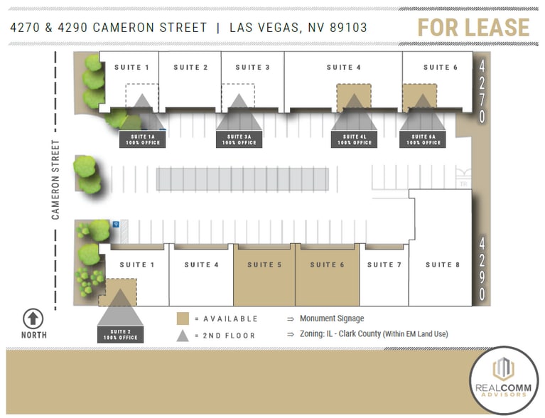4270 Cameron, Suite 6A: Monthly Base Rent: $1.00/SF NNN + Monthly NNN Fees: $0.26/SF = $1,750 Total Monthly (Plus Utilities). 1,389 SF 2nd Floor Space - 100% HVAC Office. The HVAC Office Space consists of an Open Plan, Two (2) Private Offices, IT/Storage Room, and One (1) Private Restroom.