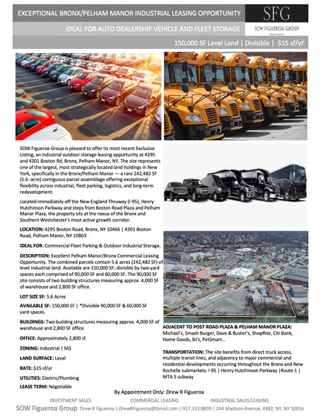 SOW Figueroa Group is pleased to offer its most recent Exclusive Listing, an industrial outdoor storage leasing opportunity at 4295 Boston Rd, Bronx, 10466 and 4301 Boston Rd, Pelham Manor, NY 10803. The site represents one of the largest, most strategically located land holdings in New York, specifically in the Bronx/Pelham Manor — a rare 242,482 SF (5.6 -acre) contiguous parcel assemblage offering exceptional flexibility across industrial, fleet parking, logistics, and long-term redevelopment. Located immediately off the New England Thruway (I-95), Henry Hutchinson Parkway and steps from Boston Road Plaza and Pelham Manor Plaza, the property sits at the nexus of the Bronx and Southern Westchester's most active growth corridor. The site benefits from direct truck access, multiple transit lines, and adjacency to major commercial and residential developments occurring throughout the Bronx and New Rochelle submarkets. LOCATION: 4295 Boston Road, Bronx, NY 10466 | 4301 Boston Road, Pelham Manor, NY 10803 IDEAL FOR: Commercial Fleet Parking & Outdoor Industrial Storage. DESCRIPTION: Excellent Pelham Manor/Bronx Commercial Leasing Opportunity. The combined parcels contain 5.6 acres (242,482 SF) of level industrial land. Available are 150,000 SF; divisible by two-yard spaces each comprised of 90,000 SF and 60,000 SF. The 90,000 SF site consists of two building structures measuring approx. 4,000 SF of warehouse and 2,800 SF office. LOT SIZE SF: 5.6 Acres AVAILABLE SF: 150,000 SF | *Divisible 90,000 SF & 60,000 SF yard spaces. BUILDINGS: Two building structures measuring approx. 4,000 SF of warehouse and 2,800 SF office. OFFICE: Approximately 2,800 sf. ZONING: Industrial | M3 LAND SURFACE: Level RATE: $15 sf/yr UTILITIES: Electric/Plumbing LEASE TERM: Negotiable ADJACENT TO POST ROAD PLAZA & PELHAM MANOR PLAZA: Michael’s, Smash Burger, Dave & Buster’s, ShopRite, Citi Bank, Home Goods, BJ’s, PetSmart… TRANSPORTATION: The site benefits from direct truck access, multiple transit lines, and adjacency to major commercial and residential developments occurring throughout the Bronx and New Rochelle submarkets. I 95 | Henry Hutchinson Parkway | Route 1 MTA 5 subway