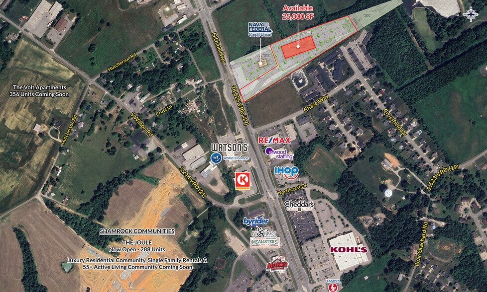 Approximately 5.13 acres with an option for a proposed 25,000 ±SF multi-purpose building is available for lease, sale or build-to-suit in Elizabethtown, KY. The site sits behind and shares cross access with a brand-new Navy Federal Credit Union and there are plans for a large pylon sign exclusively for the available lot. Elizabethtown, Hardin County, KY is one of the fastest growing cities/counties in Kentucky, with close proximity to Radcliff and Fort Knox. Immediate area retailers and restaurants include: Kohl’s, Walmart, Kroger, At Home, Mouser Cabinetry, IHOP, Cheddar’s Scratch Kitchen, Zaxby’s, Best Buy, Barnes & Noble, Red Lobster, Chick-fil-A, Popeyes and Golden Corral.