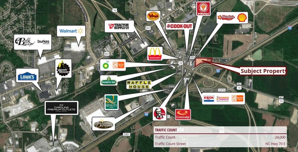 Discover the prime investment opportunity in the thriving Smithfield-Selma market. Situated in an Opportunity Zone, this property offers convenient access to US Hwy 70 and is surrounded by a thriving commercial landscape. Investors will appreciate the close proximity to retail hotspots, including the Carolina Premium Outlets and the Selma Antique District. The area boasts a strong retail presence, making it an ideal location for a Free-Standing Building and Hospitality. With its strategic location and access to major transportation arteries, this property presents an exceptional opportunity for retail investors seeking to capitalize on the dynamic growth of the in the area. Located at the I-95/US 70 (Future I-42) interchange (Exit 97) in Selma. Property is 18 miles to I-40 via I-95, 23 miles to Goldsboro via US 70 and 31 miles to Raleigh via US 70 to I-40. Property is in the Federally designated "Opportunity Zone". Census reports show 7-9 million visitors per year to the area. Walking distance to several QSR's and less than a mile from Carolina Premium Outlet Center.