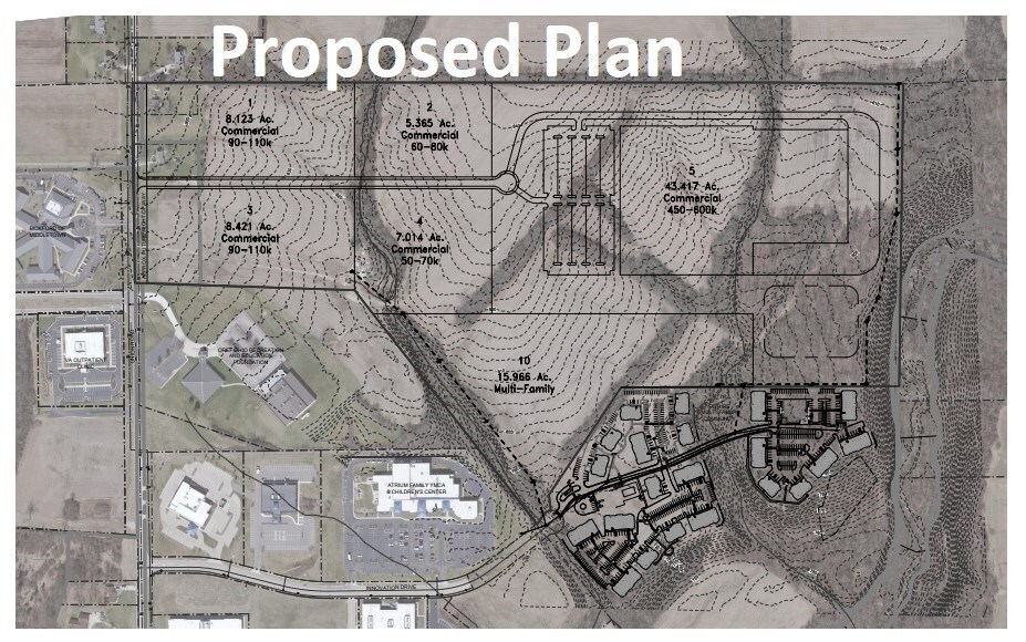 Flexible zoning – BCF (Business Center Flex) Uses include manufacturing, light industrial, office, conference center, medical, assisted living facilities, research. Possible zone change to MF or Residential for a portion.