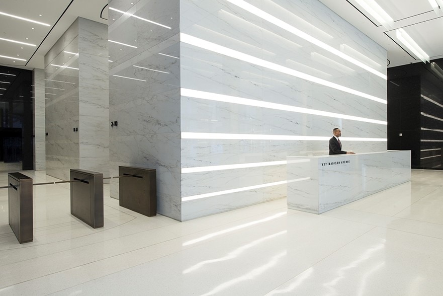 Designed in the Modernist style by the renowned architecture firm of Emery Roth & Sons, 437 Madison Avenue was built in 1967 by the William Kaufman Organization. The 40-story building sits at the epicenter of one of the world’s most prestigious thoroughfares, flanked by internationally famed hotels, boutiques and restaurants, and within close proximity of Central Park. A $60 million capital improvement program has completely transformed the building featuring fully modern environments, including redesigned lobby and plaza area, upgraded interior corridors and bathrooms, new building systems and mechanicals, and restored exteriors, among other improvements. At 437 Madison Avenue, tenants will enjoy extravagant greenery on a private 15th floor Sky Lounge with spectacular views of St. Patrick’s Cathedral as an added amenity. Built-in planting beds with crepe myrtle trees, perennials and ornamental grasses create a “garden in the sky” where paved walkways, movable tables and chairs, illuminated stainless steel, fiberglass shades and glass railings adorn the 8,870 square foot terrace. Tenants can reserve conference tables on the terrace for meetings at no charge.