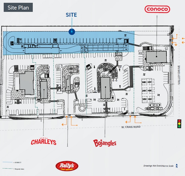 This shovel ready, separately parceled 1.25 acre pad is available for sale, build-to-suit, or ground lease. Utilities are stubbed to the pad. The newly developed retail center, scheduled for completion in July 2026, sits on the arterial Craig Rd. corridor and features a Conoco C-Store, Bojangles, Rally's, Charley's Cheesesteak, and Black Bear Diner, all of which will drive heavy traffic to the site. The pad is accessible from both Craig Rd and Valley Dr, with the retail center situated on the north west corner of a signalized intersection.
