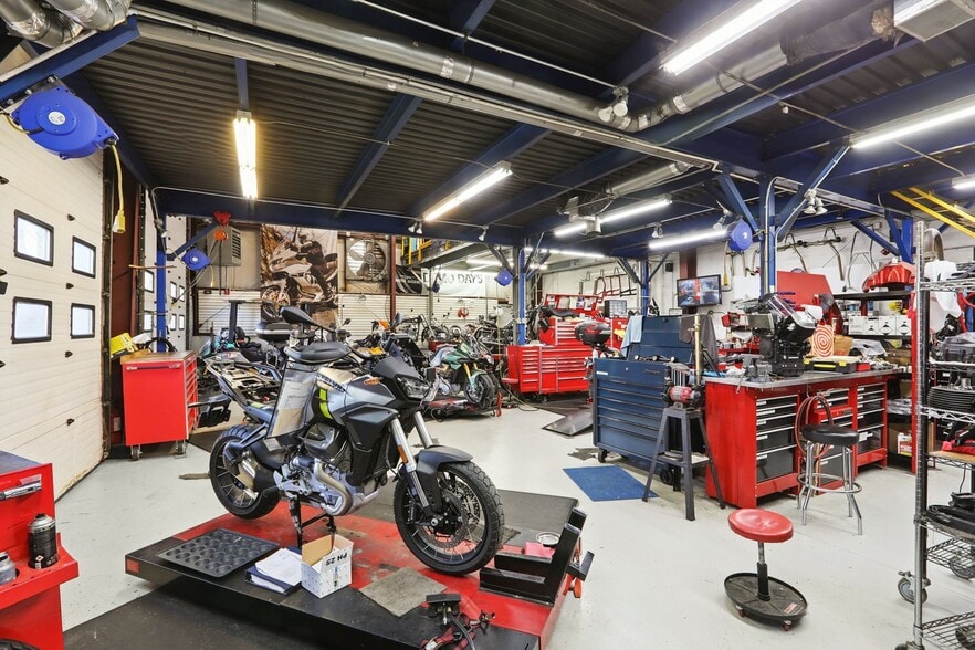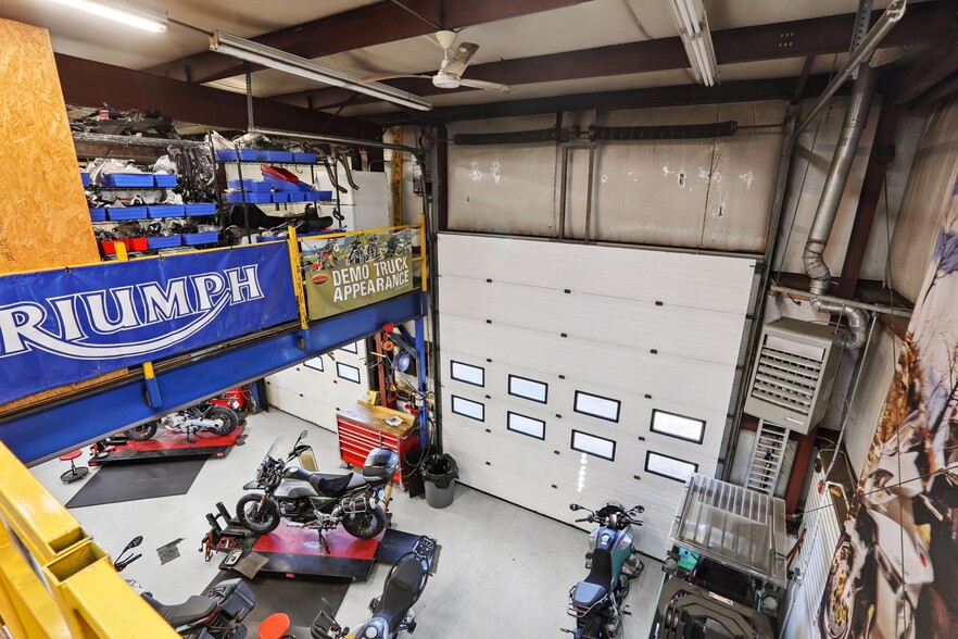 Exceptional commercial opportunity at a highly visible intersection. This well-established motorcycle sales and service dealership offers approximately 5,700 sq ft of versatile space including 4,440 sq ft of warehouse and 1,260 sq ft of retail showroom area. The building features nearly 2,000 sq ft of dedicated service bay space with two overhead doors, ideal for service, repair, or light industrial use. A large mezzanine level provides additional storage or operational flexibility.