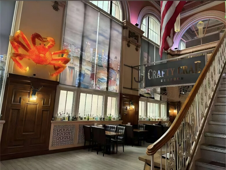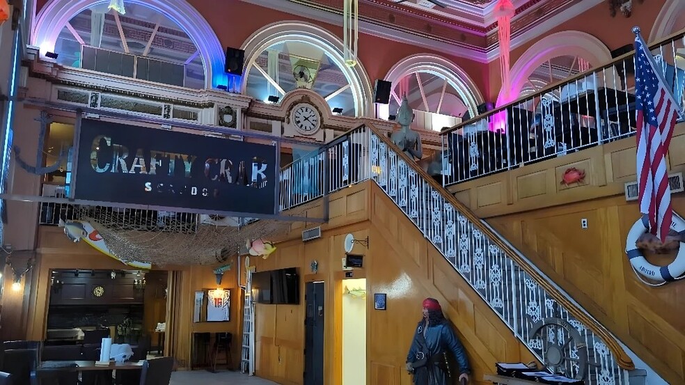 Currently operating as the iconic Crafty Crab, the property is fully built out with a commercial kitchen, dining areas across multiple levels, and lower-level storage and freezer space. The building is ideal for an owner-operator, restaurant group, or investor seeking a flagship downtown location.