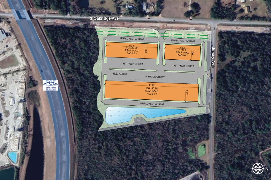 First Coast Commerce Center is Clay County’s newest premier industrial park, strategically positioned in Green Cove Springs within Northeast Florida’s emerging growth corridor. This master-planned, 34-acre development offers three state-of-the-art Class A rear-loaded buildings totaling approximately 428,220 SF. Each building features 32-foot clear heights, ESFR sprinkler systems, and site-cast tilt-up concrete construction with modern architectural finishes. Designed for flexibility and scalability, the park provides abundant car parking, 135-foot truck courts, and both dock-high and drive-in loading options. The location delivers unmatched connectivity with direct access to U.S. Highway 17, SR 16, and the new First Coast Expressway, linking to I-295, I-95, and I-10. Businesses benefit from proximity to JAXPORT, Jacksonville International Airport, and Cecil Commerce Center, as well as a robust labor pool drawn from Clay, Duval, and St. Johns counties. Clay County’s pro-growth environment, streamlined permitting, and lower operating costs make this an ideal choice for logistics, distribution, and light manufacturing operations.