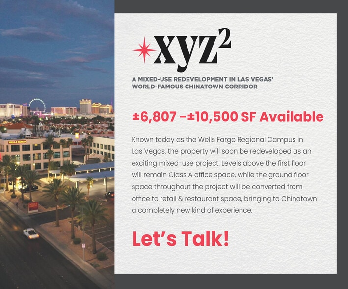 Introducing XYZ Square(d), A Mixed-Use Redevelopment in Las Vegas' World Famous-Chinatown Corridor This space offers prime Spring Mountain Road frontage on the hard corner of Spring Mountain and Arville, with entry from the main parking area.
