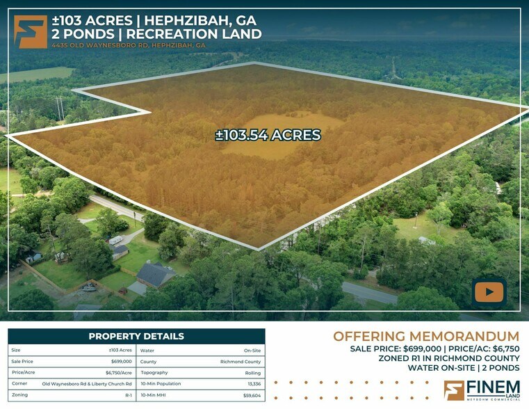 The Finem Group at Meybohm Commercial is pleased to exclusively present 4335 Old Waynesboro Road for sale. This ±103.54-acre corner parcel, situated at the intersection of Old Waynesboro Road and Liberty Church Road in Hephzibah, Georgia, offers a compelling opportunity for rural investment, private estate development, or recreational use. Zoned R-1 and spanning over 100 acres, the property includes approximately 20 acres of cleared land suitable for pasture, agriculture, or future homesites; 6 acres of water features, including a 1-acre pond and surrounding wetlands; and the remaining acreage is primarily forested. Natural features such as a pond, moderate wetlands, and gentle streams shape the landscape, offering both aesthetic and functional benefits. Rolling topography and dual road frontage enhance site accessibility and allow for flexible ingress/egress and subdivision potential. The property balances natural privacy and open space with direct access to Augusta’s broader infrastructure network, just 20 minutes north. Whether held as a long-term investment, configured for family compound development, or operated as a recreational retreat, this tract delivers scale, access, and diversity in one of Richmond County's most peaceful settings. 4335 Old Waynesboro Road is located at the corner of Old Waynesboro Road and Liberty Church Road in southern Richmond County. Positioned just 20 minutes from downtown Augusta, the site benefits from regional access via U.S. Highway 25 and enjoys proximity to employment centers, services, and regional logistics infrastructure. The surrounding area consists of low-density residential and timberland tracts, ideal for buyers seeking rural acreage with convenient access. Hephzibah continues to attract users looking for balance between open space and proximity to Augusta’s growing metro area.