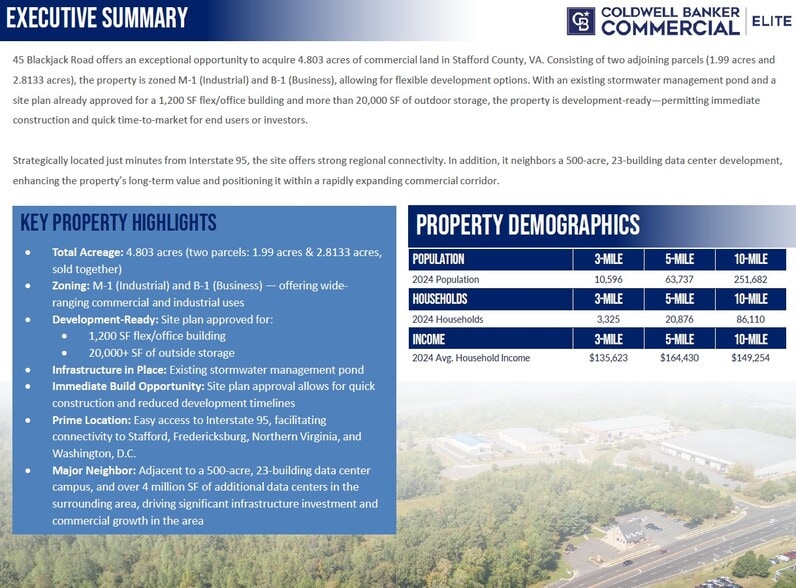45 Blackjack Road offers an exceptional opportunity to acquire 4.803 acres of commercial land in Stafford County, VA. Consisting of two adjoining parcels (1.99 acres and 2.8133 acres), the property is zoned M-1 (Industrial) and B-1 (Business), allowing for flexible development options. With an existing stormwater management pond and a site plan already approved for a 1,200 SF flex/office building and more than 20,000 SF of outdoor storage, the property is development-ready—permitting immediate construction and quick time-to-market for end users or investors.