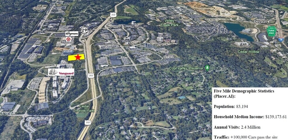 Matthews Road Associates L.P. and Arrowmink Real Estate Advisors are pleased to present an exciting ready-to-build extended-stay suites hotel development opportunity in a highly sought-after location surrounded by in-place demand. The fully approved development consists of a 153-unit hotel extended stay hotel on an outstanding 6.42-acre site in Malvern, PA. The site is strategically positioned along Route 202, contiguous to The Vanguard Group’s 87-acre global headquarters, and Uptown Worthington, the 1.1 million square foot mixed-use urban retail & residential village. The site boasts remarkable visibility and accessibility to over 70,000 passing vehicles daily. With Vanguard's headquarters hosting between 12,000-14,000 employees and visitors weekly, there exists a lucrative market for hospitality services in this thriving location, including extended stay suites.