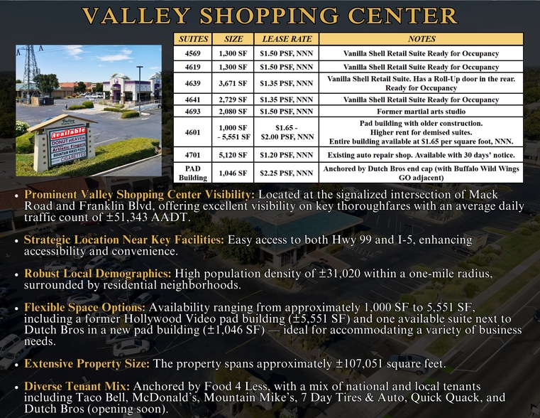 Valley Shopping Center offers excellent exposure at one of South Sacramento’s most traveled intersections — Mack Road and Franklin Boulevard. This established retail hub serves a dense residential trade area with over 31,000 residents within one mile and convenient access to both Highway 99 and I-5. The center features a strong tenant mix anchored by Food 4 Less, with McDonald’s, Taco Bell, Mountain Mike’s, and 7 Day Tires among its co-tenants. Multiple retail suites are available ranging from approximately 1,000 to 6,400 square feet, including a newly built pad adjacent to Quick Quack Car Wash and Dutch Bros (opening spring in 2026). Several units are delivered in vanilla shell condition and ready for immediate occupancy, while others offer specialty layouts such as a former martial arts studio and an existing auto repair shop. Whether you’re expanding a service business, opening a restaurant, or seeking high-visibility retail space in a busy neighborhood center, Valley Shopping Center provides excellent flexibility and visibility for a wide range of users.