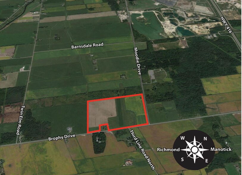 4600 Brophy Drive is a well-situated land opportunity just southwest of the Brophy/Bankfield exit off Highway 416. It is well positioned for its highway proximity, and also for its location adjacent to the future Alottawata Water Recreation Park at the highway access point for Richmond and Manotick. The parcel is also nearby an existing carpool drop off and pick up site. With the Village of Richmond currently slated for growth up to triple its current size and the anticipated water park across the street, this will be a busy and strategic location for the future.